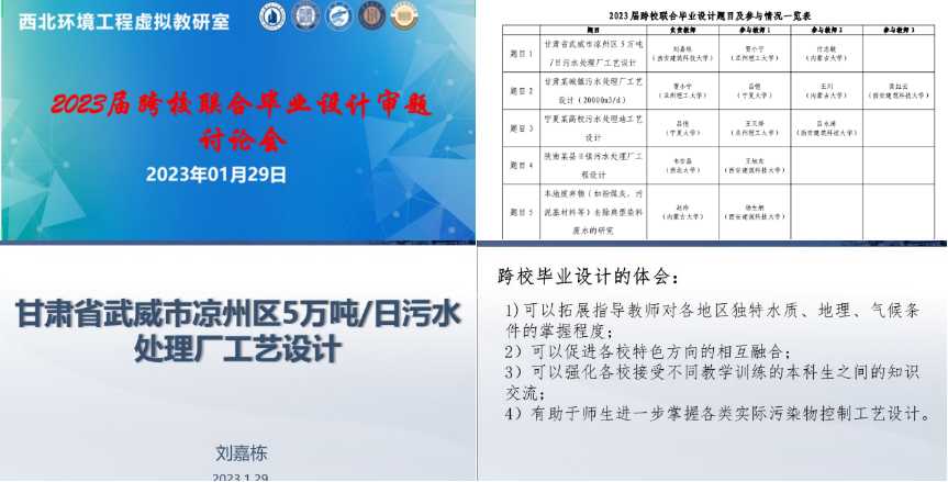 西北环境工程虚拟教研室联盟单位包括西安建筑科技大学、西北大学、兰州理工大学、宁夏大学、内蒙古大学等五所高校。跨校联合毕业设计是西北环境工程虚拟教研室在毕业设计环节教学手段和实践模式的创新,旨在提升各高校环境类本科生系统解决西北地区复杂环境工程问题的能力,为西北地区乃至全国培养环境类专业卓越工程师。(撰稿:王天烽;终审:任鹏)