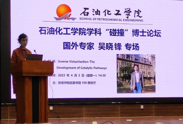 4月3日,应石油化工学院邀请,利物浦大学研究员吴晓锋来校开展学术交流,并在石化学院学科“碰撞”博士论坛作题为“Inverse Vulcanisation—The Development of Catalytic Pathways”的专场学术报告。报告由石化学院副院长赵霞主持,副院长梁瑞及学校部分教师及研究生100余人听取了报告。