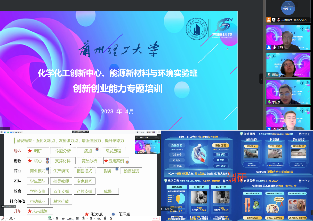 为深入落实创新创业教育贯穿人才培养全过程教育教学理念总结第八届中国国际“互联网+”大学生创新创业大赛成果、发掘和培育优秀创新创业项目、提升教师指导创新创业项目的能力,2023年4月19日至26日,石油化工学院举办了五场创新创业能力提升专题培训。专题培训由石油化工学院主办,化学化工创新中心和“能源新材料与环境”新工科创新创业实验班协办。石化学院副院长李世友在专题培训上致辞,“双万计划”应用化学国家一流专业负责人王毅教授主持会议,第六届、第七届中国国际“互联网+”大学生创新创业大赛优秀导师谭琳、第六届中国国际“互联网+”大学生创新创业大赛优秀导师赵丹及创新中心、实验班全体师生400余人参加培训。