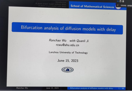 吴然超教授做了题为《Bifurcation analysis of diffusion models with delay》的精彩学术报告。报告结束后,报告人吴然超教授详细地解答了师生提出的相关问题,并且就共同关注的热点问题、研究生培养等展开了探讨与交流。通过此次学习交流,让在读的研究生了解了当前的学术前沿及热点,同时也加强了与同行之间的学术交流。