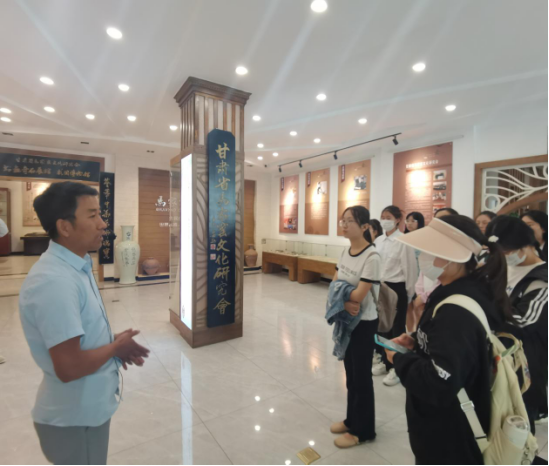 图为馆长向队员介绍马家窑彩陶博物馆