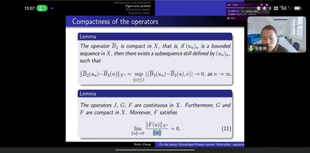 张彬林教授和邓圣兵教授分别做了题为《On the planar Schrodinger-Poisson system: bifurcation and regularity》《Some results about the weighted elliptic problems》的精彩学术报告。报告结束后,两位教授详细解答了师生提出的相关问题,并且就共同关注的热点问题展开了探讨与交流。通过此次学习交流,一方面让相关研究生了解了当前的学术前沿及热点,同时也加强了与同行之间的学术交流。(撰稿:关雯;终审:张维权)