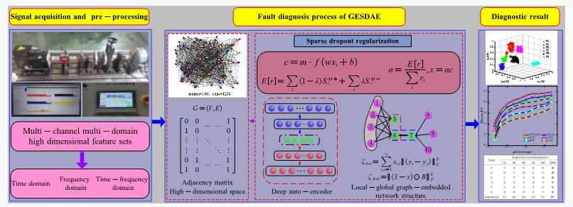 滚动轴承作为旋转机械的核心部件,其运行状态直接关系到工业装备的可靠性与安全性。针对复杂工况下轴承故障频发、传统方法在高维稀疏数据处理中表现不佳等问题,在赵荣珍教授的指导下,作者提出了一种基于图嵌入半监督深度自编码器(GESDAE)的故障数据降维方法。该方法创新性地将振动信号构建为图结构,并结合深度学习与正则化机制提升特征提取效率与模型鲁棒性。实验结果表明,该方法在多个实验平台上均取得了优异的故障识别效果,在特征可分性、可视化分析等方面也表现出显著优势。