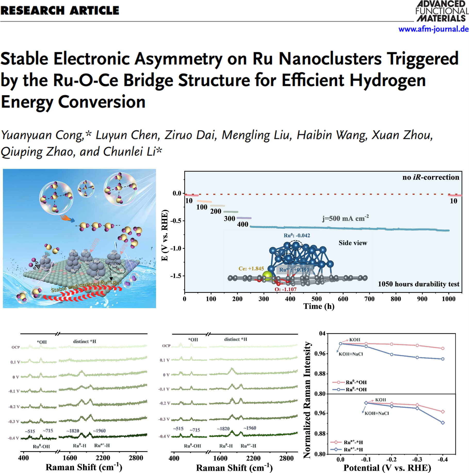 近日,我校石油化工学院李春雷研究团队在国际顶刊Advanced Functional Materials(影响因子为19.0)发表了题为“Stable Electronic Asymmetry on Ru Nanoclusters Triggeredby the Ru-O-Ce Bridge Structure for Efficient HydrogenEnergy Conversion”的最新研究成果。石油化工学院青年教师丛媛媛和2022级硕士研究生陈露云为该研究的共同第一作者。