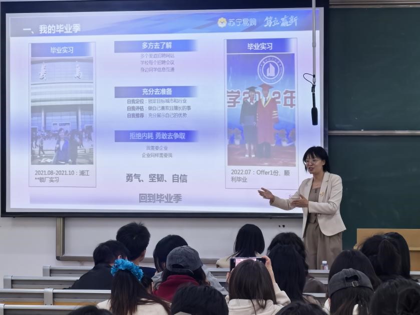 会上,刘晓飞以“我的毕业期”为切入点,从毕业实习选择、个人职业定位、自我能力评估到主动自我推荐等关键环节,向在场毕业生分享了宝贵经验。她结合自身10余年的职场经历,针对经管类专业毕业生关注的核心岗位,如促销员、市场运营、采购、零售云商户等,进行了详细的解读并鼓励毕业生面对毕业季的迷茫与压力,要学会拒绝内耗,以坚韧的心态、自信的姿态和勇敢的行动去争取就业机会。她说,不同岗位对从业者的能力要求各有侧重,毕业生在求职过程中需结合自身优势与职业规划精准选择,在工作中要敢于尝试、积极探索,在实践中不断积累经验、提升能力,实现个人职业成长与发展。