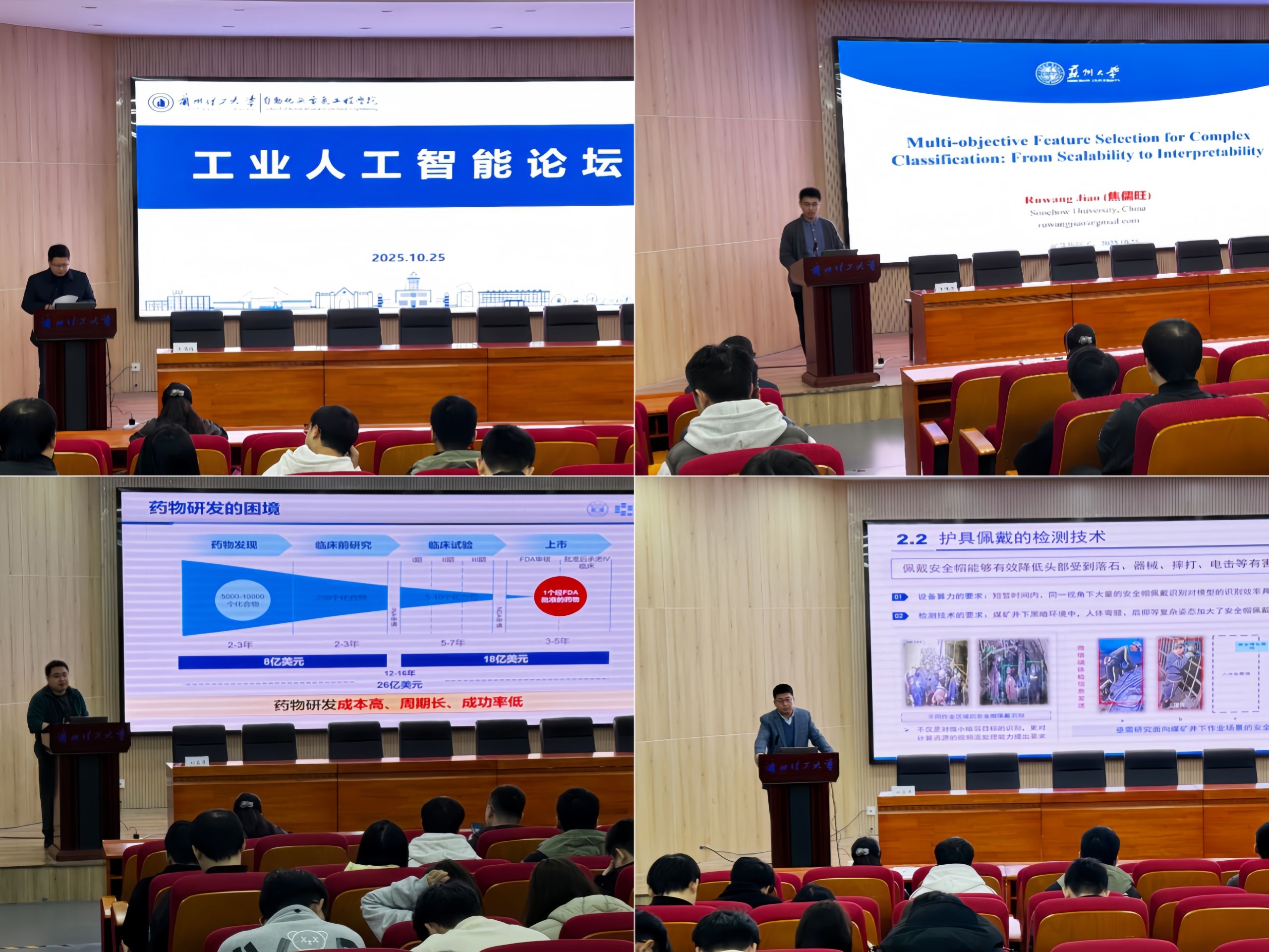 焦儒旺以《面向复杂分类任务的多目标特征选择:从可扩展性到可解释性》为题,系统阐述了特征选择在应对“维数灾难”中的关键作用及其面临的多重挑战,并分享了团队在可扩展性与可解释性研究方面的最新进展。刘益萍在报告《智能药物分子设计与合成》中,重点介绍了多目标分子生成与合成路径预测的创新方法,生动展示了人工智能在药物研发中的跨学科应用实践。左明成则以《智慧矿山建设中的典型问题和AI解决方案》为题,深入探讨了AI技术在打通数据孤岛、提升矿山安全与生产效率方面的实际案例与解决方案。