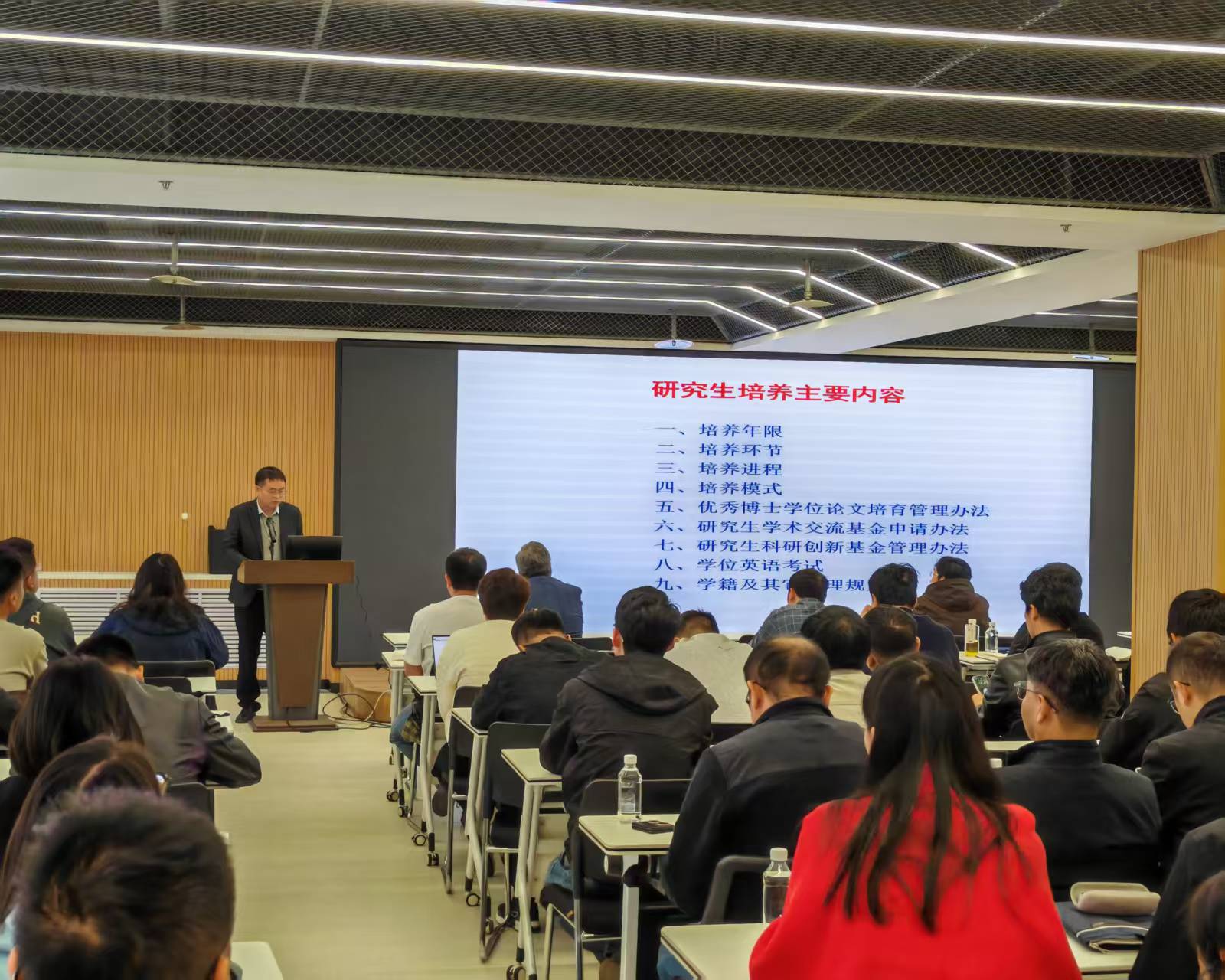 冯力副院长以《研究生培养主要内容》为题,围绕培养年限、培养环节、培养进程、培养模式、优秀博士学位论文培育管理办法、研究生学术交流基金申请办法、研究生科研创新基金管理办法、学位英语考试、学籍及其他管理规定等核心政策进行系统解读,重点明确了导师在研究生思想引领、学术诚信、科研创新、职业发展等方面的职责与使命,着重强调了导师是“研究生培养第一责任人”的根本要求。