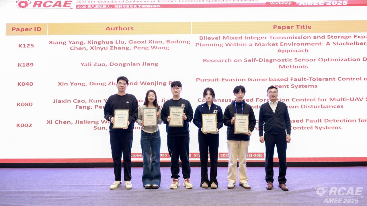 近日,自动化学院师生参加第八届机器人、控制与自动化工程(RCAE2025)国际会议。会议由IEEE、IEEE Robotics & Automation和西安工业大学主办,西安交通大学、西北工业大学、西安电子科技大学、长安大学等联合承办。会议采用线下线上融合模式,吸引全球500余位专家学者、工程技术人员及研究生代表参会,为机器人控制领域的各位学者,提供了一个关于机器人控制与自动化工程最新进展的交流与传播平台。
