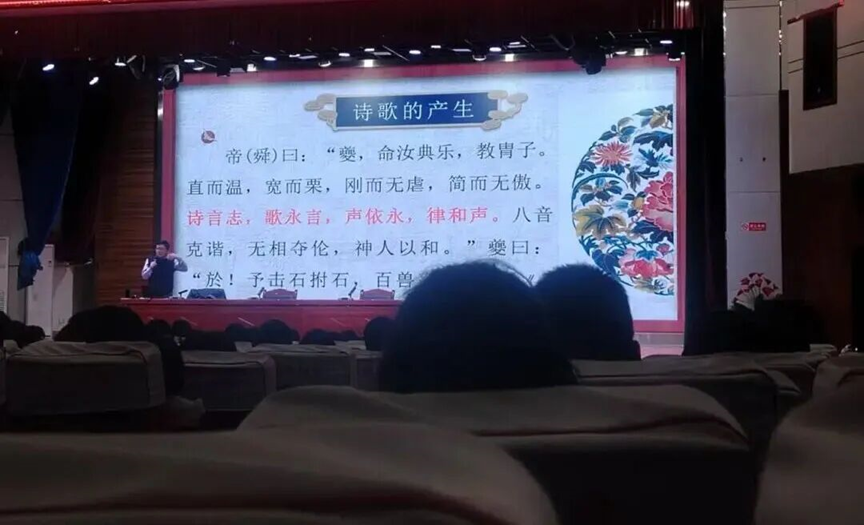 钱得运围绕“中华经典诗词的多维度内涵”展开讲解,结合经典文献、历史典故与诗词案例,系统阐释诗词起源与早期形态、社会功用与价值、核心创作手法等精彩内容。引《尚书》“诗言志,歌永言”追溯诗歌起源,借《论语》“《诗》可以兴,可以观,可以群,可以怨”解析诗词多元功能,同时聚焦“赋、比、兴”创作技法,提炼诗词对个体成长的五大价值,还以杜审言《和晋陵陆丞早春游望》为例逐句解析意境之美。现场学生专注聆听、认真记录,不少同学表示,讲座让自己对于诗词背后的文化内涵与美学价值有了更深的理解,同时也激发了自己深入学习中华经典的兴趣。