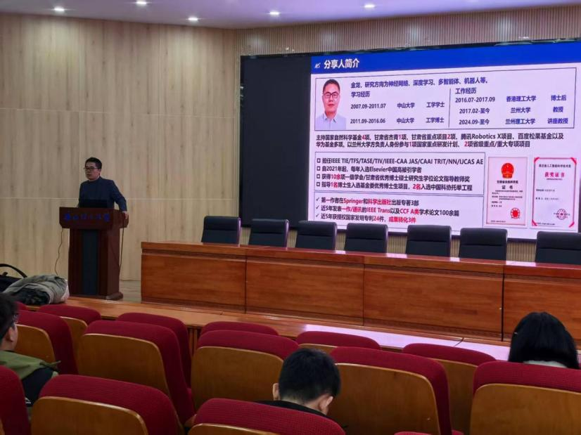 蒋栋年对金龙教授的到访表示欢迎,并简要介绍了其在人工智能领域的学术成就。他表示,邀请名师进校交流是学院加强科研内涵建设、拓宽研究生学术视野的重要举措。希望以此次交流为契机,深化与学界顶尖专家的联系合作,进一步凝聚科研合力,为学院学科建设注入新活力、开辟新路径,为培养兼具创新思维与实践能力的高素质人才奠定基础。