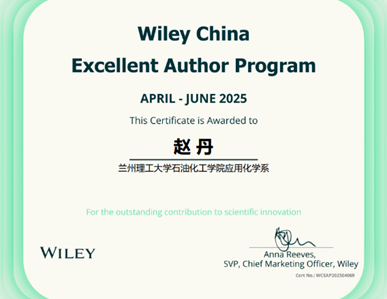 近日,石油化工学院赵丹副教授团队发表在约翰威立国际出版集团(John Wiley & Sons, Inc.简称Wiley)ChemistrySelect的综述论文“Recent Advances in Lithium Ion Sensing Using Fluorescent Probes With Different Structures”受到全球学者的广泛关注,该论文截至2025年10月15日下载量为159次,作者团队被授予2025年第二季度“Wiley中国高贡献作者奖”荣誉称号。论文通讯作者为赵丹副教授。