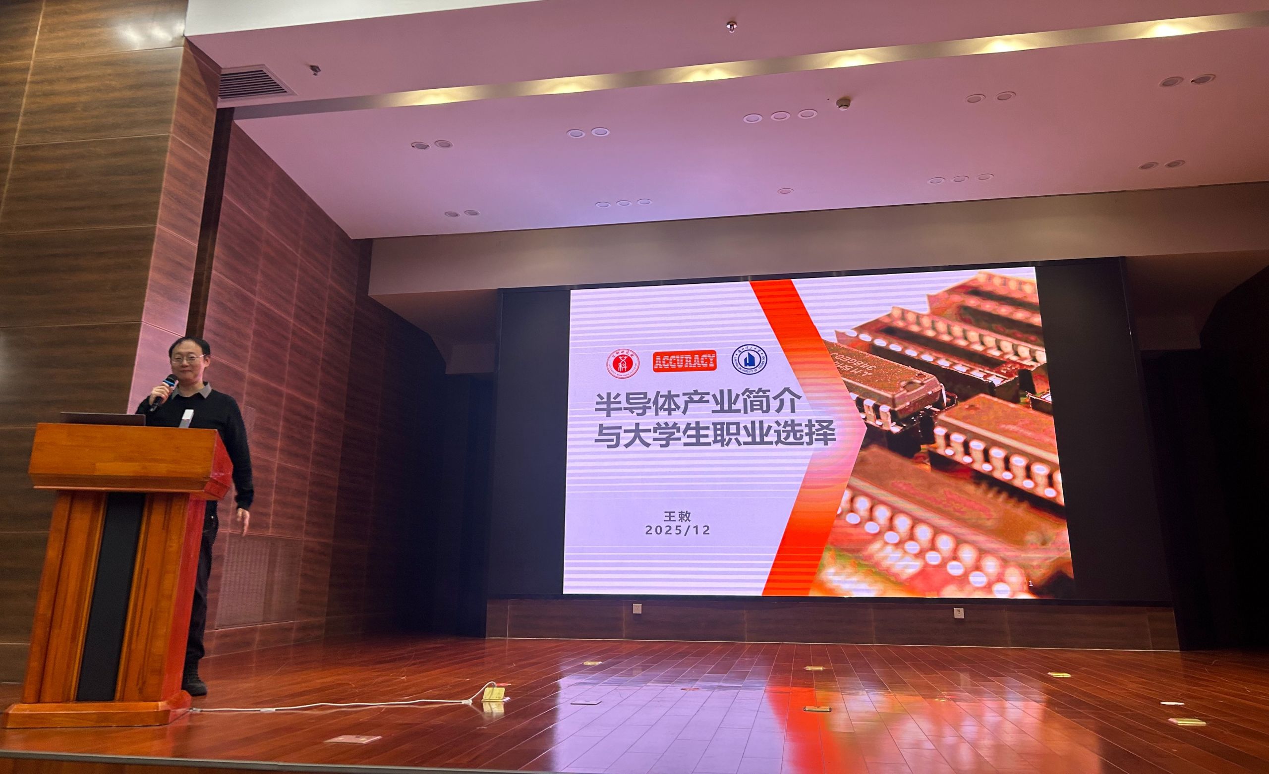 王敕教授以《半导体产业简介与大学生职业选择》为题,立足国家战略导向与产业宏观布局,系统解析全球半导体产业趋势、技术瓶颈及中国突破路径。他表示,半导体领域的创新突破本质上是材料科学、精密制造、自动控制、软件算法及基础物理等多学科深度融合的系统工程,亟需高校打破学科壁垒,培育具有跨学科知识体系与协同创新能力的复合型工程科技人才。结合自身产业实践与创业经验,王敕教授就青年学子如何厚植科技报国情怀、构建支撑产业创新的知识能力矩阵、规划硬科技领域职业发展等关键问题,提出兼具前瞻性与实践指导价值的深刻见解,引发师生强烈共鸣。