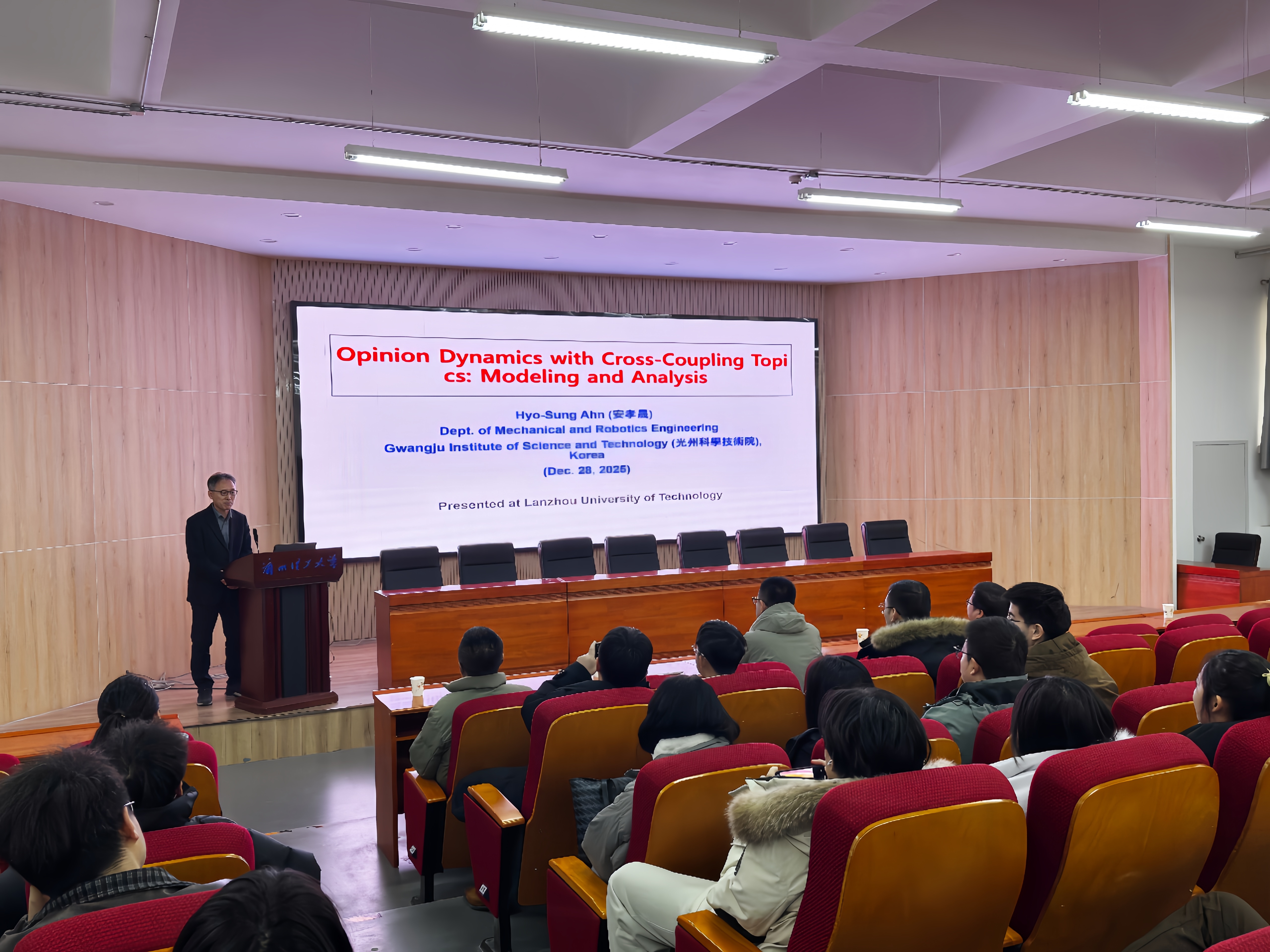 12月28日上午,自动化与电气工程学院携手学院柔性引进专家兰州大学金龙教授,特邀韩国光州科学技术院机械与机器人工程学院Hyo-Sung Ahn(安孝晟)教授、芬兰奥卢大学信息技术与电气工程学院李帅教授,在舒卷楼D401举办学术研讨会。本次研讨会由学院副院长蒋栋年教授主持,吸引了学院百余名教师和研究生参加。