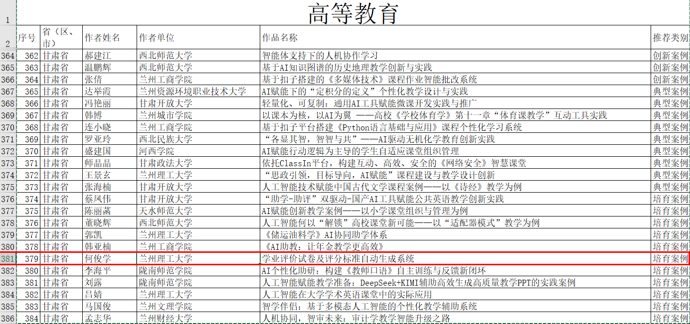 近日,教育部技术与资源发展中心(中央电化教育馆)公布2025年教师人工智能应用案例征集活动结果,我院自动化系何俊学老师申报的《学业评价试卷及评分标准自动生成系统》案例入选培育案例名单。