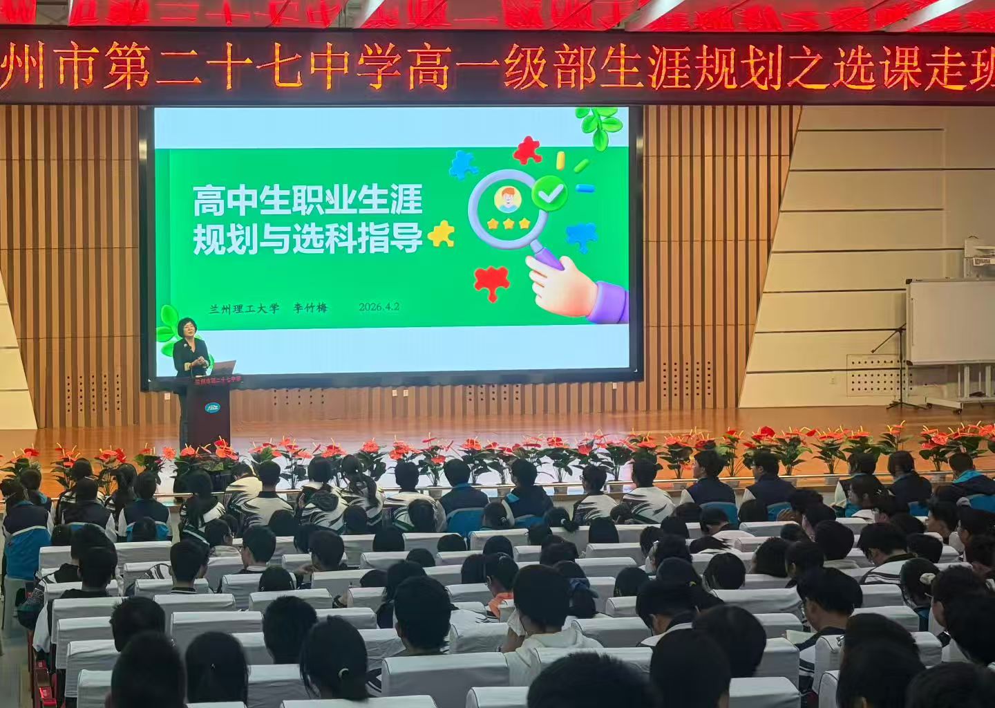 新高考改革背景下,选科抉择关乎学业方向,职业规划点亮成长之路。为帮助高中生破解选科困惑、树立清晰的生涯发展理念,搭建高校与高中衔接的育人桥梁,近日,我校李竹梅老师走进兰州市第二十七中学,开展“预见未来·筑梦启航”高中职业生涯规划与选科指导公益活动,以高校视角、青春力量,为高中700多名学子送上一份实用又暖心的成长指南。