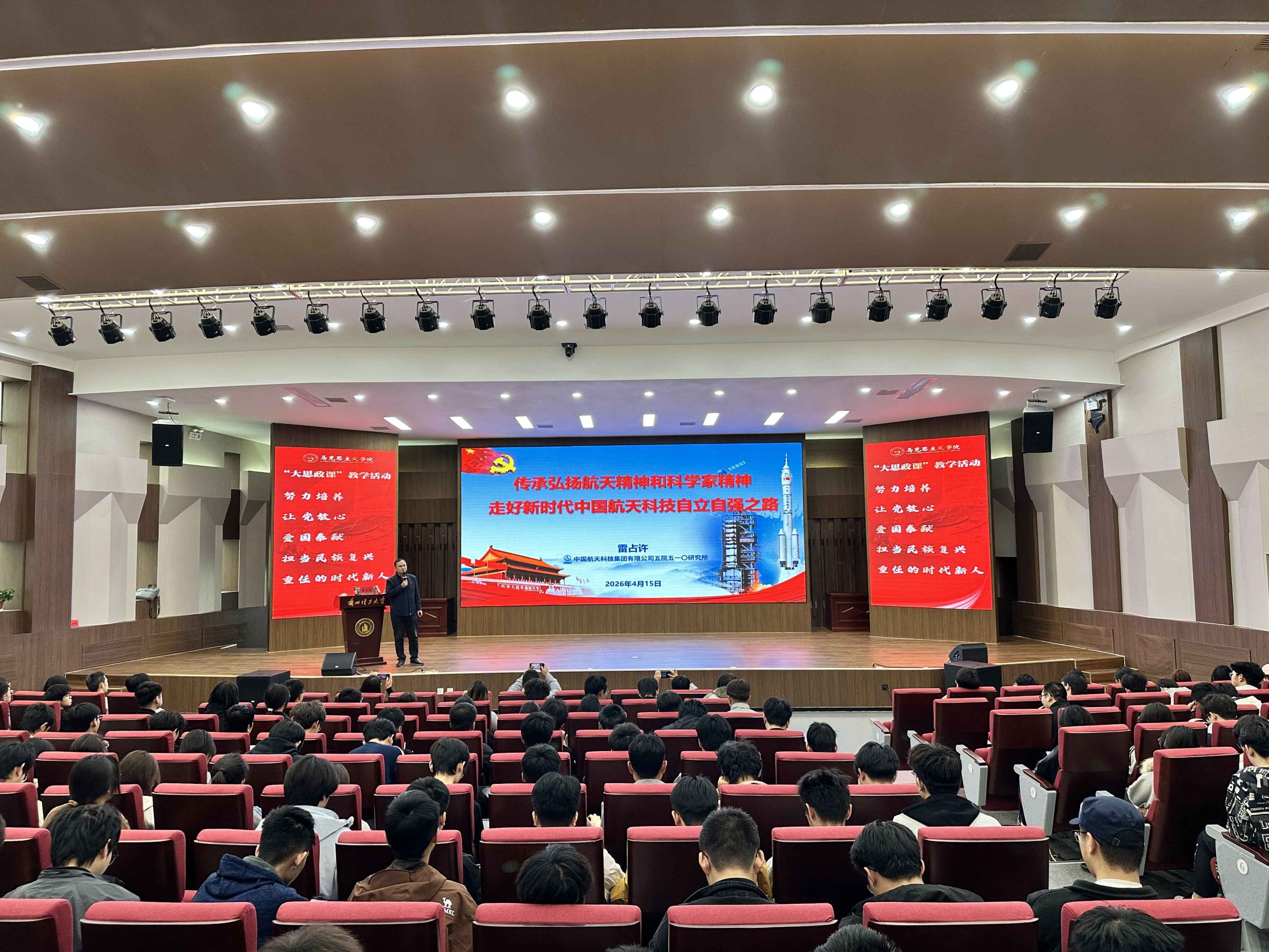 为深入贯彻落实习近平总书记关于“大思政课”建设的重要指示精神,推动思政小课堂与社会大课堂深度融合,在第11个“4·15”全民国家安全教育日之际,马克思主义学院紧扣国家安全教育日“统筹发展和安全 护航‘十五五’新征程”的年度主题,于4月15日下午在兰工坪校区学术交流中心举办了“传承航天精神 建设航天强国——走好新时代航天科技自立自强之路”为主题的“大思政课”教学活动。学院院长饶旭鹏、教师代表以及2024级材料、冶金、新能源专业共300余名师生参加了此次活动,共同上了一堂国家安全与理想信念教育课。
