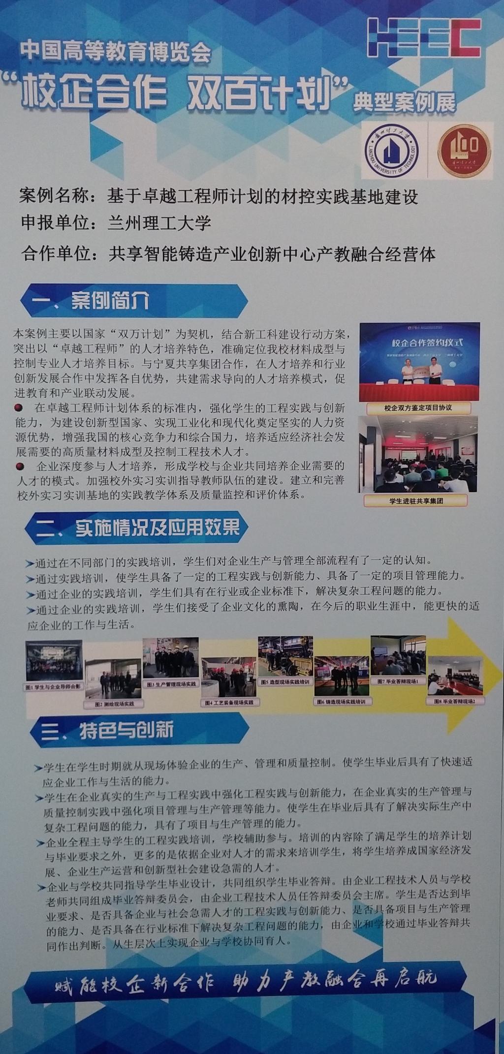 此次中国高等教育博览“校企合作 双百计划”共申报案例1100余项,经过专家筛选,315个申报案例入选 “校企合作 双百计划”典型案例展。兰州理工大学材料学院“基于卓越工程师理念的材控实践基地建设”案例从全国众多案例评选中脱颖而出,成为甘肃省为数不多的入选案例,凸显了学院对校企合作及工程实践工作的重视,充分展示了兰州理工大学材料学院与宁夏共享集团合作的成果。