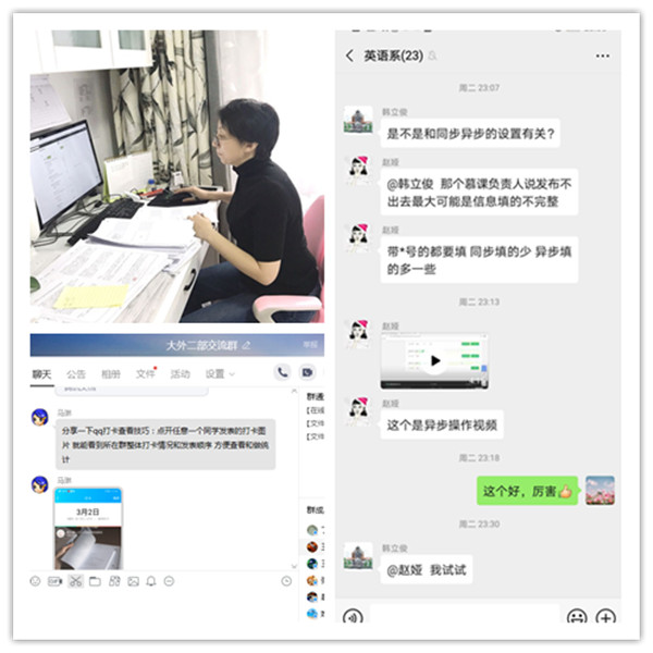 技术传帮带,小白变行家。开展线上教学,最大的阻力是线上教学平台的操作技术。我院课程形态复杂,线上教学平台涉及超星、welearn、中国大学慕课、中国高校外语慕课等,且为了应对学习通等上课平台网络拥堵等情况,QQ群、腾讯视频会议、钉钉直播等成为线上教学必要的预案。在过去传统课堂中,很多老师对于线上教学平台没有使用接触,此次突如其来的疫情,让线上教学成为必然,不少教师,特别是年纪较大的老师对于这些平台的使用需要从头学起。对此,很多年轻老师主动承担起“技术顾问”,帮助大家一起克服技术难题,让技术小白逐渐变成直播行家。