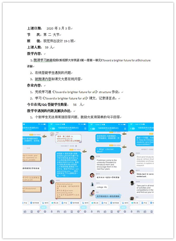 设计线上教学日志,创新教学管理。全新的线上教学,对课堂教学环节的督导同样带来困难与挑战。我院大学外语第一教学部的老师们集思广益,群策群议,设计了针对线上教学的“线上教学日志模板”,及时跟踪和小结每次课堂的实际情况,针对每一课可能出现的问题及时做出调整。该线上教学日志一经发布,全院效仿,为线上教学保质保量开展提供了有力的保障手段。