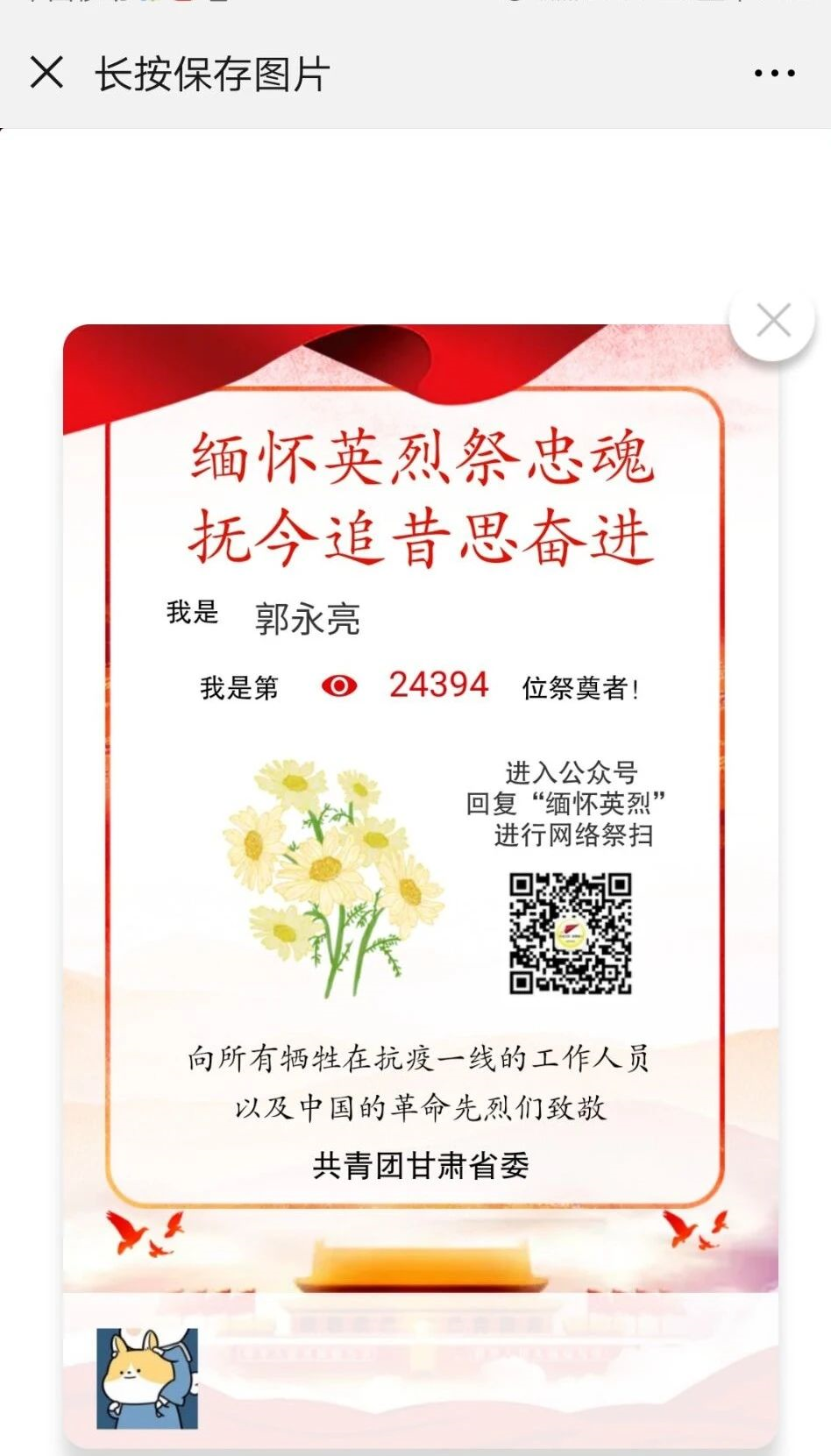 研究生同学们积极转发官方媒体的哀悼追思内容,在微博、微信、QQ、学工微信、“甘肃青年”微信公众号书写致敬缅怀词,向为民族复兴、国家富强而英勇献身的民族英烈致敬,深切悼念牺牲在抗击新冠肺炎疫情一线的英雄们。大家纷纷表示将始终以昂扬的斗志和饱满的热情投入到日常学习中,认真配合学校疫情防控的决策部署,用实际行动践行“小我融入大我,青春奉献祖国”的誓言。