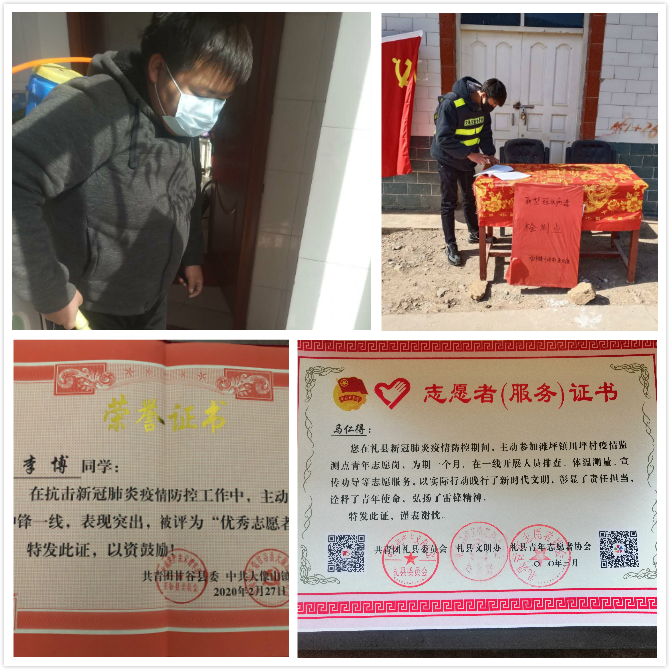 马仁得同学来自电气工程及其自动化17级1班,在疫情防控的关键时刻,加入陇南市礼县青年防疫防控支队,参与自己所在滩坪镇川坪村疫情防控监测点青年志愿者岗。作为志愿者,马仁得同学的工作主要是在劝阻点值班、对外来人员家附近以及村里主要道路进行消毒等。在值班点对外来人员以及走亲访友的群众进行劝阻。