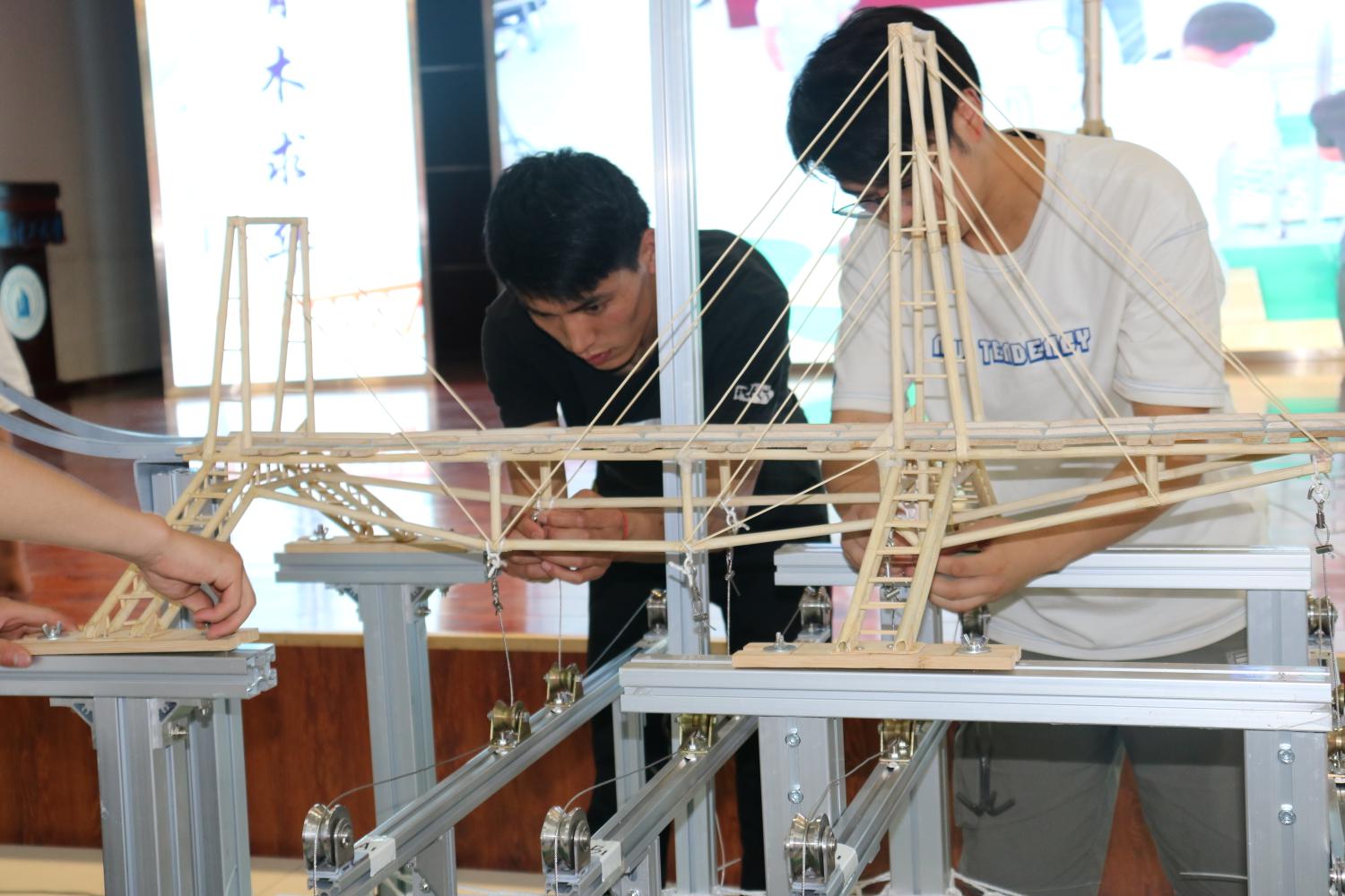 竞赛以“变参数桥梁结构模型设计与制作”为赛题,同学们利用课程所学知识,充分发挥想象,将充满灵性的创造力与理性的专业知识融合在一起,化成一座座独特的桥梁结构模型。竞赛通过理论方案、模型制作、现场展示与答辩、加载表现四个方面进行综合评分。参赛同学在提交理论方案计算书后,在评委面前对本组作品进行展示与现场答辩,随后开始激动人心的现场加载环节。整个竞赛过程紧张有序,精彩纷呈,充分展示了土木学子的专业知识运用以及创新、协作的能力。