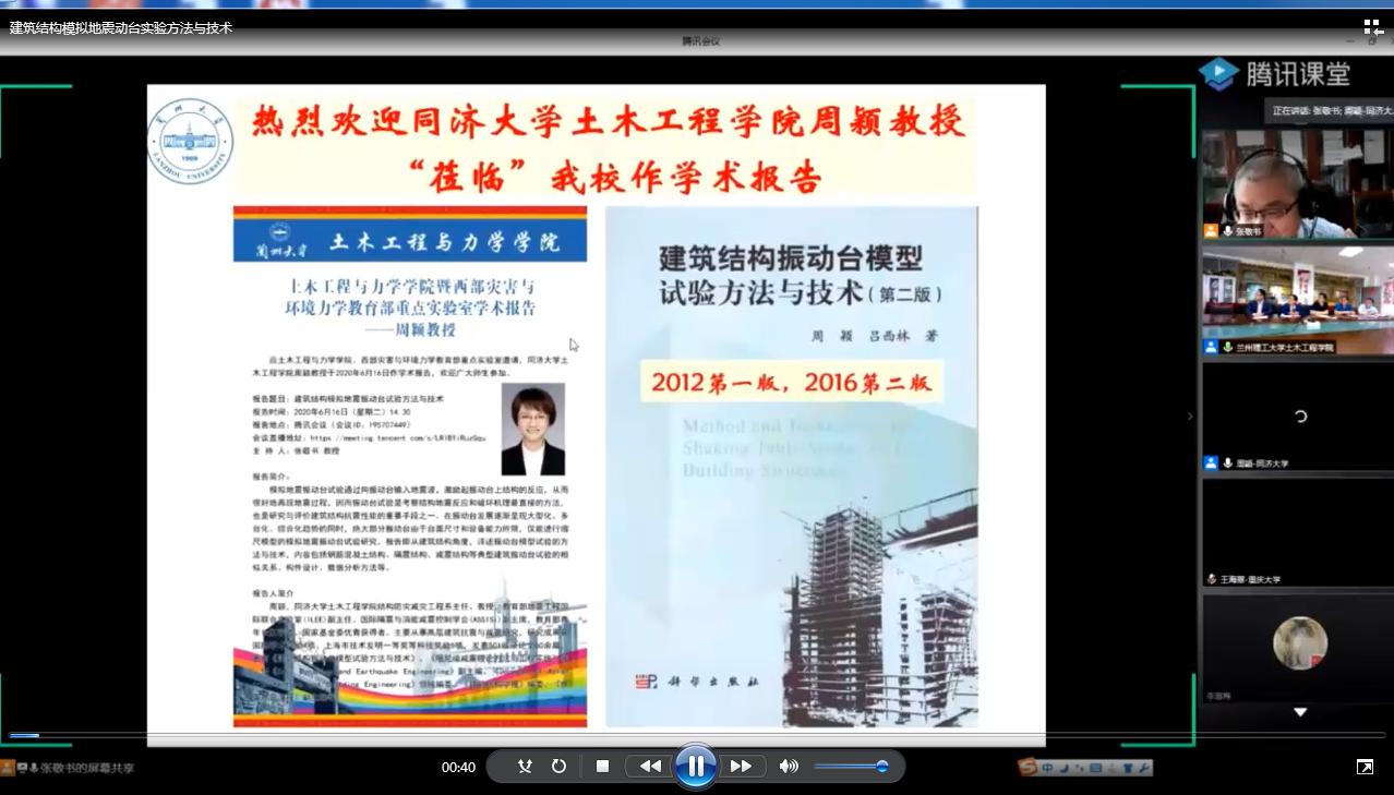 6月16日,兰州理工大学省减隔震国际合作基地与兰州大学西部环境力学重点实验室联合组织西部土木工程防灾减灾2020年研究生暑期班授课,邀请同济大学土木工程学院周颖教授线上作了本年度暑期班的第一场学术报告。兰州大学土木系结构学科带头人张敬书教授与我校国际合作基地负责人杜永峰教授担任联席主持人。报告开始前,举办了简短的开幕仪式。双方主持人分别介绍了周颖教授学术业绩和组织研究生暑期班的背景。学校教务处处长韩建平教授、土木工程学院院长王文达教授、程选生教授和殷占忠教授等出席开幕式。周颖教授做了题为“建筑结构模拟地震振动台试验方法与技术”的学术报告,来自兰州理工大学、兰州大学、兰州交通大学、甘肃农业大学、西北民族大学等省内土木工程院校的研究生和导师代表500余人通过腾讯课堂平台转播腾讯会议的模式参加了活动。