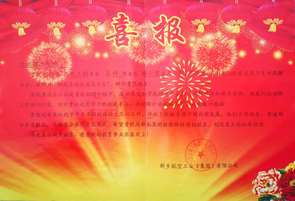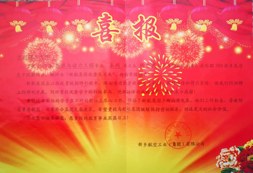 近日,新乡航空工业(集团)有限公司向学校发来喜报。能动学院2019届能源与动力工程专业本科毕业生杨吉武和机械电子工程专业本科毕业生路小雪在见习期表现优秀,在同期300余名见习生中脱颖而出,被评为“新航集团优秀见习生”。