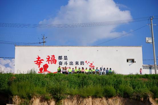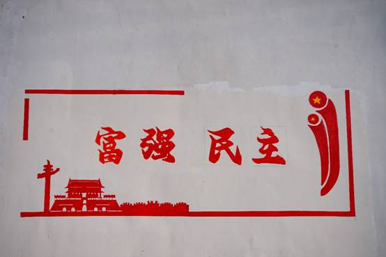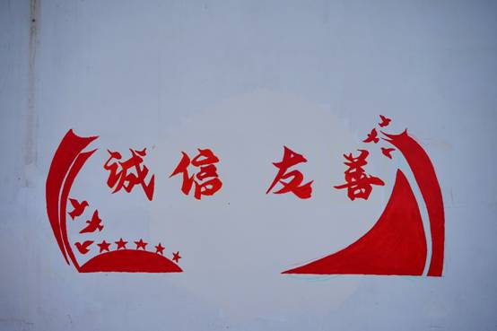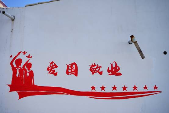 新农村文化墙,队员们以社会主义核心价值观为主要内容,根据地势高、道路弯曲狭窄的特点,以红色剪影为主要形式进行设计,以便从远处看也能够醒目亮眼。主题墙面两边没有遮挡,紫外线特别强,队员们仍旧顶着炎炎烈日认真绘画。尽管戴着帽子,还是晒伤了后颈和手臂。但当看到最后的作品,想起村民们的热情帮助,还有村里孩子们洋溢的笑容,队员们都觉得不虚此行,辛苦也是值得的。