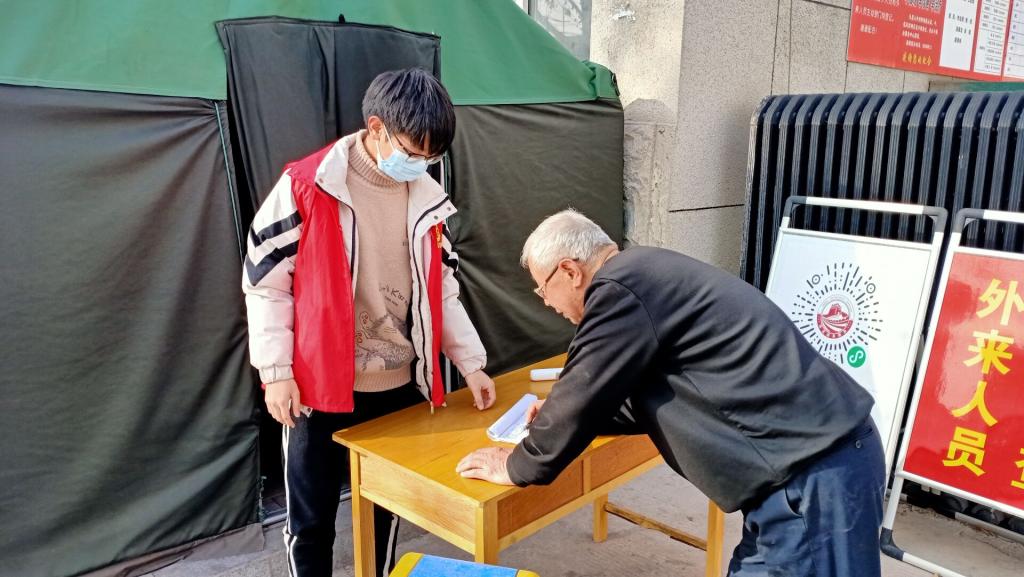 每天按时来到值班点对进出人员进行登记是郭建辉同学的工作,一放假他便报名参加了当地的社区防控疫情志愿服务,按时按点进行值班工作。面对这些繁琐、单一的疫情防控工作,郭建辉同学努力、细致的做好每一位人员的进出登记。