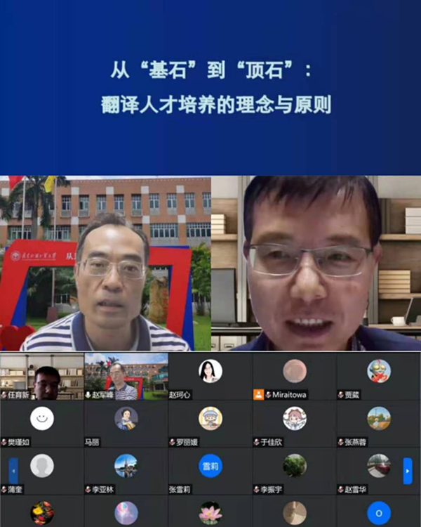 2021年5月17日晚,广东外语外贸大学赵军峰教授应外国语学院邀请做了题为《从“基石”到“顶石”:翻译人才培养的理念与原则》的线上学术讲座。此次讲座由外国语学院院长任育新教授主持,外国语学院教师、研究生以及部分高年级本科生参加了此次学术活动。