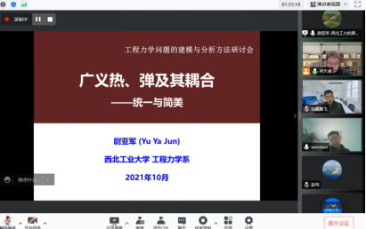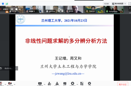 10月23日,理学院工程力学系成功举办“工程力学问题的建模与分析方法研究”线上研讨会。来自兰州大学、西安交通大学、西北工业大学、兰州交通大学、兰州理工大学等高校的专家、学者、相关专业师生40余人参加了本次研讨会,与会代表就学科建设、学术研究及研究生培养与参会师生进行了深入广泛的交流和研讨。研讨会上,3位学者分别为大家在线做了精彩的学术报告。研讨会由理学院工程力学系何天虎教授主持。