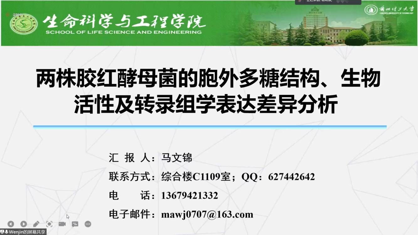 马文锦博士围绕“两株胶红酵母菌株(R.mucilaginosaCICC 33013与R.mucilaginosaCM-1)胞外多糖的结构解析、活性功能分析与转录组学差异表达”三个方面内容进行了阐述,通过详尽的图表和实例让同学们对未来多糖领域的研究方向有了新的认识和了解。随后刘子茜同学介绍了甜菜BvSnRK2s基因克隆及表达载体的构建,转基因烟草的抗逆性评价与BvSnRK2.1功能的验证,同时分享了读研期间在文献参阅、资料总结及论文写作方面的心得体会。互动环节,老师和同学们结合自己的研究方向提出了一些问题和建议,并与主讲人深入探讨课题相关的研究情况,使在场同学受益匪浅。杨院长对本次学术交流会进行了总结,他指出现阶段疫情防控的形势依然严峻,同学们要合理安排好线上听课与线下学习时间,最大限度降低疫情对学习的影响。(撰稿:马文锦;终审:陈永泰)