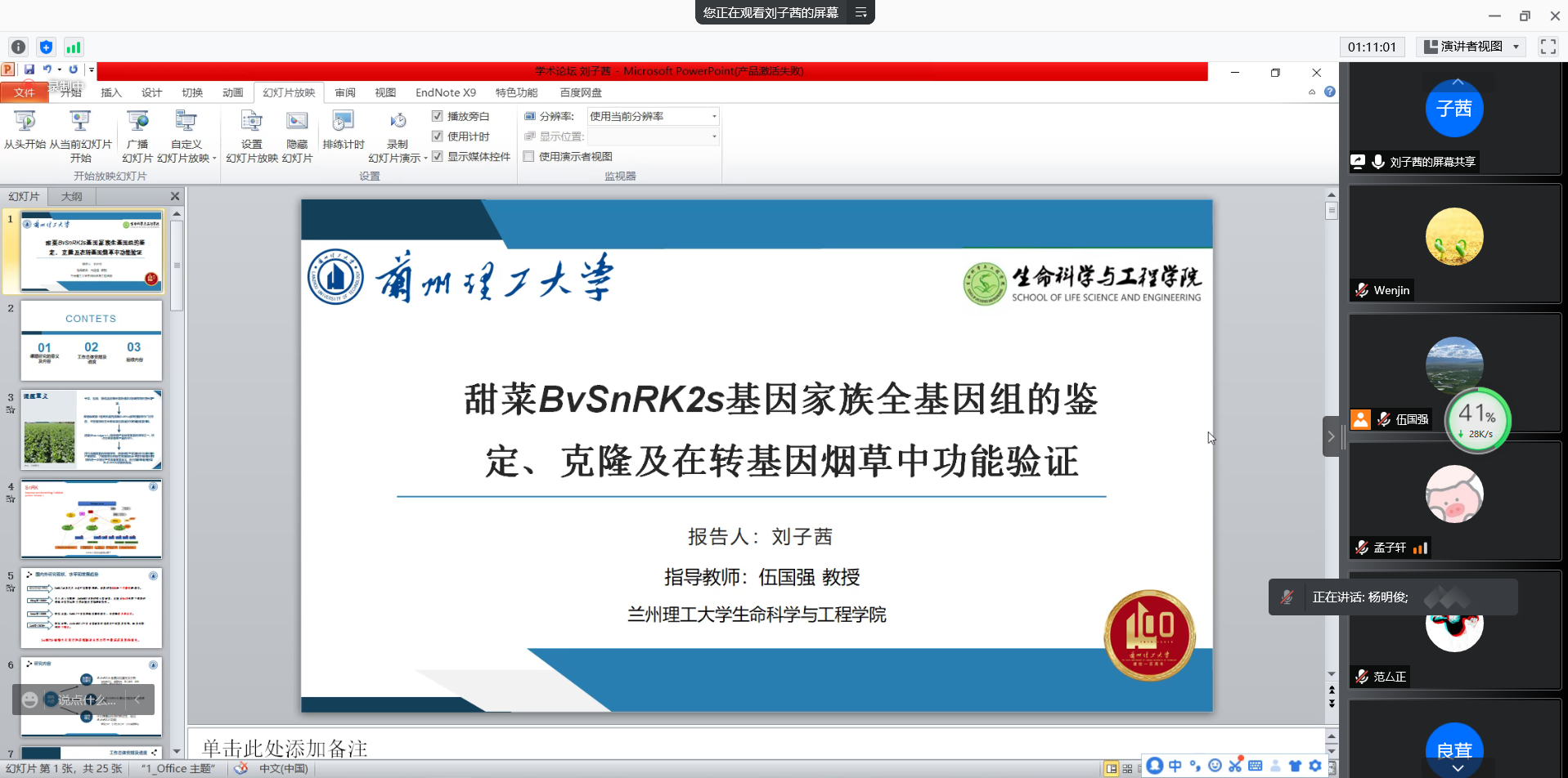 为了更充分的利用校内丰富的学术资源,提高学术专业性,拓展生命科学领域的前沿研究,让同学们更好的了解该领域基础研究、认识科研、开展科研,开拓学生研究视野,11月5日下午,生命科学与工程学院在线举办了第十一期“研究生论坛”暨“青年教师学术沙龙”交流会。报告会由学院副院长杨明俊主持,150名师生参加本次报告交流会。杨明俊为线上的师生详细介绍了马文锦博士与刘子茜同学的个人情况及在学术研究上所取得的成果。马文锦博士和在读研究生刘子茜分别作了题为《两株胶红酵母菌的胞外多糖结构、生物活性及转录组学表达差异分析》和《甜菜BvSnRK2s基因家族全基因组的鉴定、克隆及在转基因烟草中功能验证》的学术报告。
