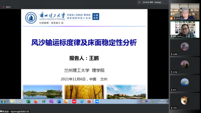 我校青年教师王鹏博士做了题为《风沙输运标度律及床面稳定性分析》的学术报告,介绍了利用连续介质理论和方法对风沙流中蠕移运动进行的理论建模工作,以及在沙床面形态演化方面的研究成果。