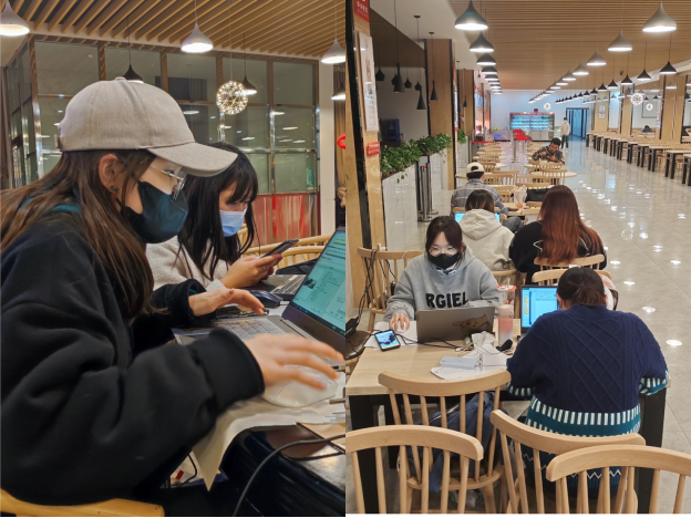 左图是一等奖获得者傅恬同学疫情期间同学们在餐厅抓紧分秒时间做比赛