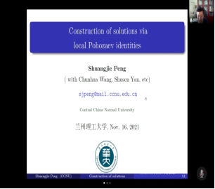 彭双阶教授做了题为《Construction of solutions via local Pohozaev identities》的精彩学术报告。报告结束后,报告人详细解答了师生提出的相关问题,同时就共同关心的话题,如研究生培养、基金申报等问题进行了交流。通过此次学习交流,一方面让相关研究生了解了当前的学术前沿及热点,同时也加强了与同行之间的学术交流。(撰稿人:王大斌, 终审人:刘全恩)