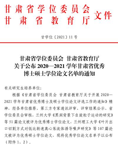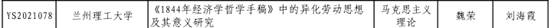 近日,甘肃省教育厅网站发布了甘肃省学位委员会、甘肃省教育厅《关于公布2020—2021学年甘肃省优秀博士硕士学位论文名单的通知(甘学位〔2021〕11号)》文件。由马克思主义学院刘海霞教授指导的硕士研究生魏荣的论文《<1844年经济学哲学手稿>中的异化劳动思想及其意义研究》被评为2020—2021学年甘肃省优秀硕士学位论文。