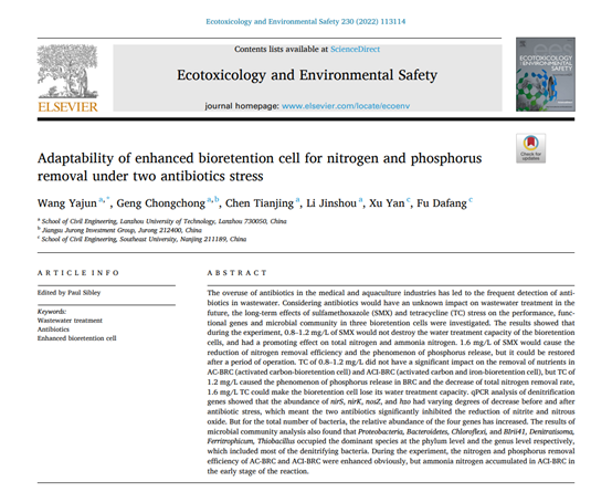 近日,毒理学与环境科学领域顶级期刊Ecotoxicology and Environmental Safety(JCR 1区,中科院毒理学1区,Top期刊)发表了我校土木工程学院王亚军老师、耿冲冲硕士以及王亚军水科技课题组完成的题为“Adaptability of enhanced bioretention cell for nitrogen and phosphorus removal under two antibiotics stress”的最新科研成果,东南大学许妍教授、傅大放教授,中科院南京地理与湖泊研究所谢丽强教授在实验方面给与了大量的指导和帮助。