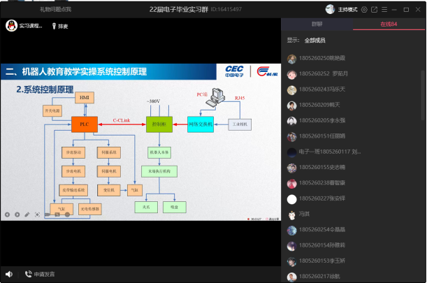 由于疫情防控形式严峻,此次毕业实习采取线上直播、专业技术资料共享、线上电子线路分析与仿真、线下检修报告撰写等多种形式开展,确保了实习质量与实习效果准确评估。线上直播采用“QQ群”平台,由甘肃长风电子科技有限责任公司培训处负责人谢向前老师及相关培训人员主讲,为学生讲解了“生产安全与保密培训”、“CFC47-3A电视机电路识别、焊接训练及故障检修”、“工业数字化智能制造生产”三部分专题内容。与历届毕业实习不同,本次实习安排了专业培训人员以长风厂智能制造信息化的发展历程为契机,结合原理讲解与实际操作视频演示,生动立体地为学生展示了先进的5G技术、物联网技术、工业机器人技术与数字化信息平台在实际工业生产领域的应用与发展。工业机器人操作的线上演示为学生弥补了因疫情无法入厂参观的遗憾,同时,在专题讲解中贯穿融入了“把握变局,规划未来”、“爱岗敬业”等思政教育,获得了学生的好评。