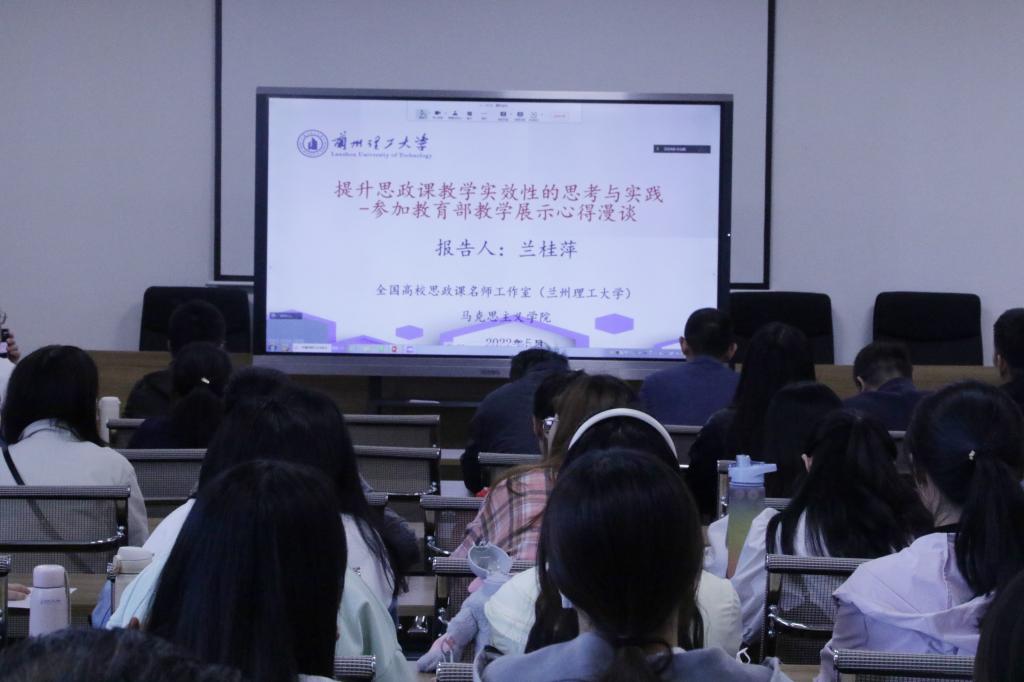 5月17日下午,全国高校思政课教学标兵、第二届全国高校思政课教学展示特等奖获得者、全国高校思政课影响力提名人物,重庆师范大学马克思主义学院副教授兰桂萍,在腾讯会议作了“提升思政课教学实效性的思考与实践——参加教育部教学展示心得漫谈”专题报告。报告会由马克思主义学院副院长孙念韶主持,马克思主义学院师生在学院学术报告厅集中聆听报告,饶旭鹏教授全国高校思政课名师工作室(兰州理工大学)全体成员及其他师生线上参加了会议。