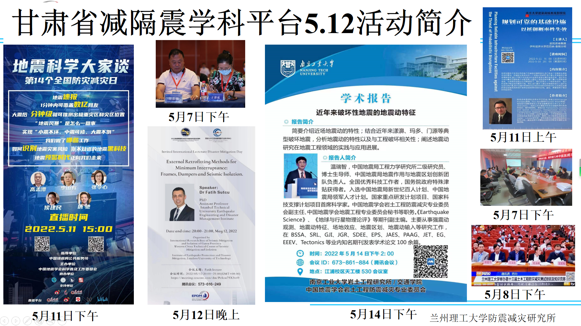 近年来,每逢国家防灾减灾日,我校都协助政府行业主管部门,借助西部土木工程减隔震行业技术中心等学科平台牵头承办西部地区减隔震系列科普学术活动。受疫情影响,今年第十四个国家防灾减灾日系列活动除了分别在兰州和乌鲁木齐的大型隔震公共建筑的两场工地技术服务之外,大部分都在线上举办。活动从5月7日开始,先后邀请到中国工程院院士、广州大学周福霖教授、中国地震局工程力学研究所温瑞智研究员、广州大学周云教授、土耳其伊斯坦布尔理工大学Fatih Sutcu博士、同济大学副教授方成博士、云南省地震工程研究院安晓文研究员等在线上做学术报告,线上线下参加本年度学术活动的人员超过2000人次。