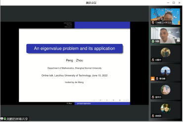 周鹏教授的报告扎实精悍,向与会者介绍了一类具有独立一般边界条件的二阶微分方程所限定的线性特征值问题,并介绍了其对上述方程建立了主特征值关于平流项系数的一个新的单调性结果。周鹏教授接下来指出,这一理论主要的方法是基于Liu和Lou提出的泛函,一个关键的发现是当限制在适当的点和函数空间时,也就是选取某种新的工作空间,可以保障相关Frechet算子具有良好性质。最后,将此单调性结果应用到一类竞争抛物系统的研究中,在比已有前人工作的基础上更大的参数范围内观察到所谓的“排除原理”,这是一项非凡的改进。(撰稿:曹佳峰;终审:刘全恩)