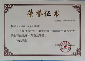 7月17日至19日,由中国制冷空调工业协会主办的第十六届“中国制冷空调行业大学生科技竞赛”通过网络答辩的方式举行。我校教师韩喜莲副教授带领建筑环境及能源应用工程专业2019级本科生李艳、张建龙、向智三人参加了本次比赛,并获得了本科生组三等奖的优异成绩。