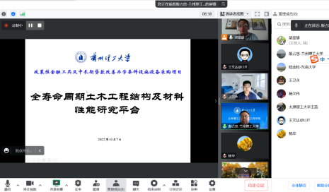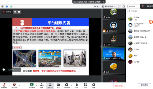 王文达对专家能在线参加论证会表示了感谢,并向与会专家就本次论证会的项目建设背景作了简要介绍。殷占忠以“全寿命周期土木工程结构及材料性能研究平台”为题,代表学院从平台建设背景及概况和平台建设内容(多种灾害作用下的结构及材料全寿命周期性能研究平台、数值模拟与仿真试验及可视化试验平台、土木工程材料与结构静动力性能测试平台),围绕学科建设需求向与会专家详细汇报了购置设备的必要性、可行性,以及具体的设备需求和预算情况。吴长就“智能建造人才培养与开发实训平台建设”从项目建设背景、项目总体建设情况、项目具体建设情况三个大的方面给各位专家作了详细汇报,并对所购买的设备与人才培养的符合度上做了补充说明。