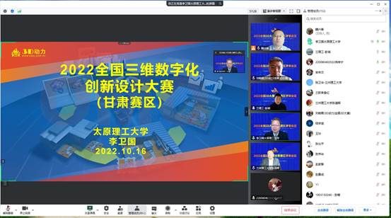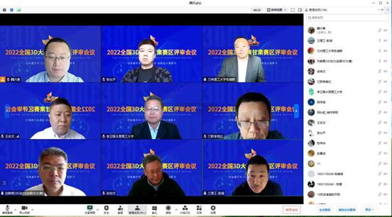 10月16日,2022年第15届全国三维数字化创新设计大赛(简称:全国3D大赛)暨第4届甘肃省三维数字化创新设计大赛评审工作会议在“云端”隆重召开。全国3D大赛组委会副秘书长、3D动力副总裁刘晓青,甘肃赛区组委会副主任、兰州理工大学教务处处长张清辉教授,甘肃赛区组委会副主任、兰州理工大学创新创业学院副院长王志文教授,甘肃赛区专家委员会主任、兰州理工大学机电工程学院院长安宗文教授,甘肃赛区专家委员会委员、甘肃赛区评审专家及教师代表和参赛学生等150余人出席了本次评审工作会议。会议由甘肃赛区组委会秘书长、兰州理工大学教务处副处长彭斌教授主持。2022年第15届全国三维数字化创新设计大赛暨第4届甘肃省三维数字化创新设计大赛由甘肃省教育厅主办、兰州理工大学承办。