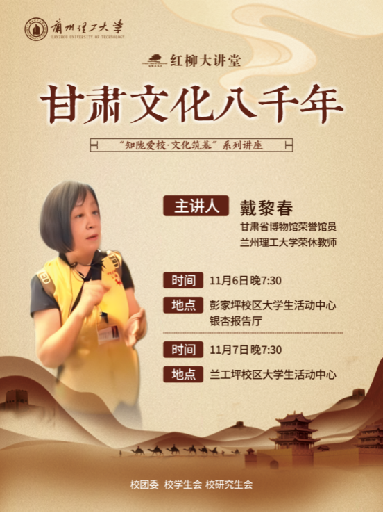 为传承弘扬陇原优秀传统文化,筑牢文化育人根基,厚植文化自信,引领我校青年学子在感知陇原文化魅力中增强本土文化认同感与家国情怀,进一步营造“知甘肃、爱甘肃、爱兰理工”的浓厚校园文化氛围,校团委特举办红柳大讲堂“知陇爱校·文化筑基”系列报告。现将首期讲座活动通知如下: