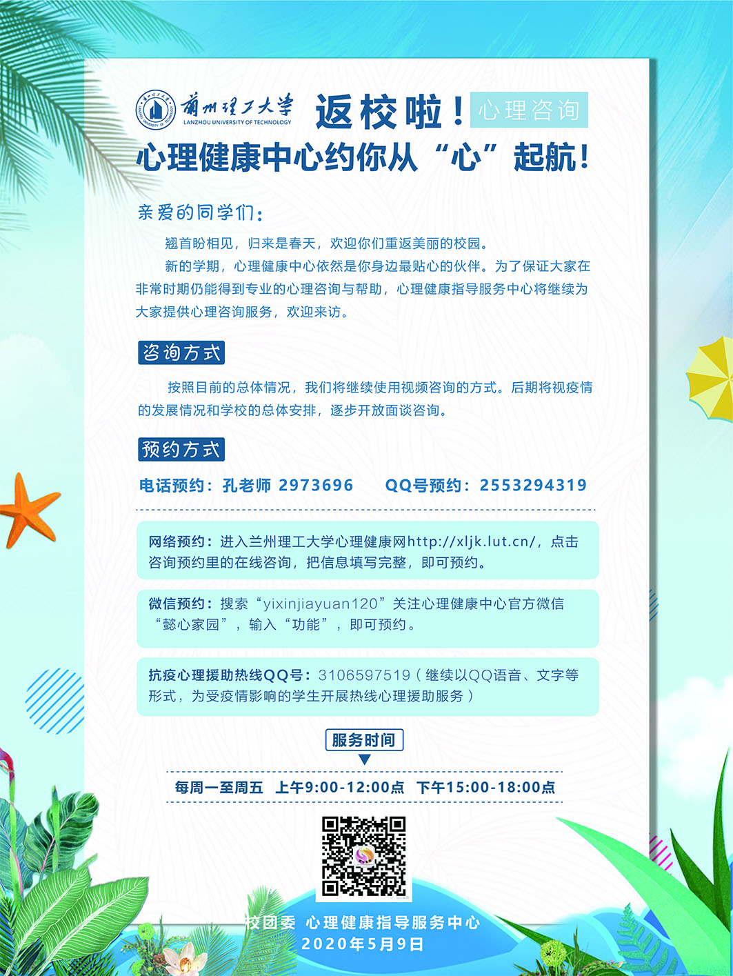 新的学期,心理健康中心依然是你身边最贴心的伙伴。为了保证大家在非常时期仍能得到专业的心理咨询与帮助,心理健康指导服务中心将继续为大家提供心理咨询服务,欢迎来访。