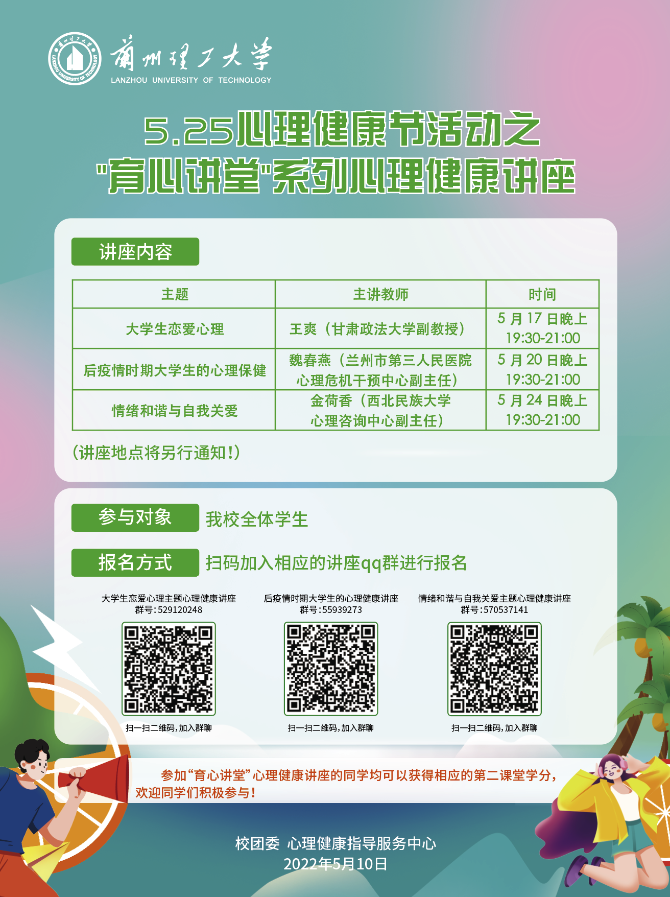 为贯彻落实《高校思想政治工作质量提升工程实施纲要》和《高等学校学生心理健康教育指导纲要》等文件精神,坚持育心与育德相结合,进一步推动我校心理育人工作落实落细,在第十九届“5.25”心理健康节期间,校团委、心理健康指导服务中心邀请到三位省内知名心理健康教育领域的专家学者为我校学生普及心理健康知识和理念,引导同学们更好地接纳自我,发展自我,具体内容安排如下: