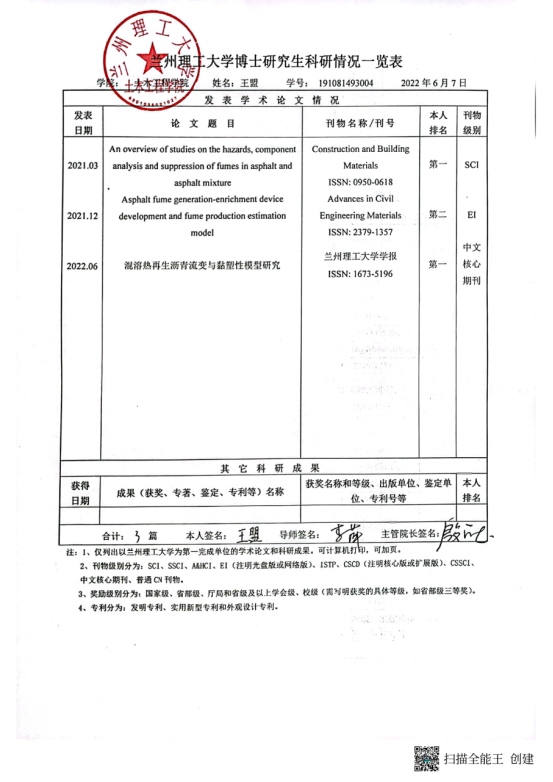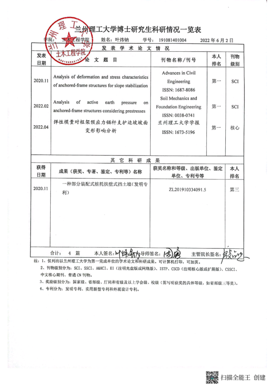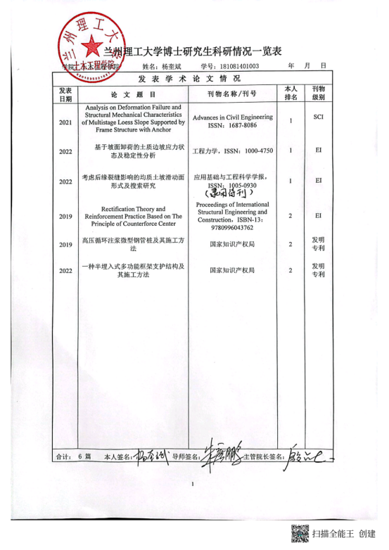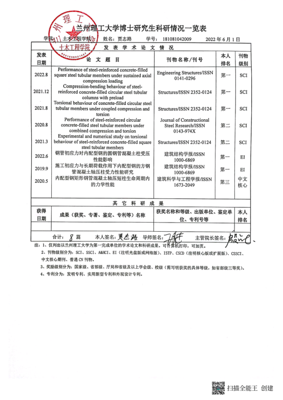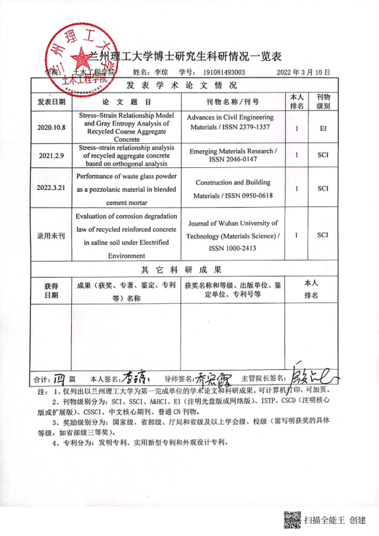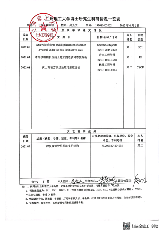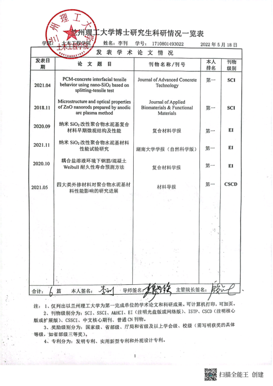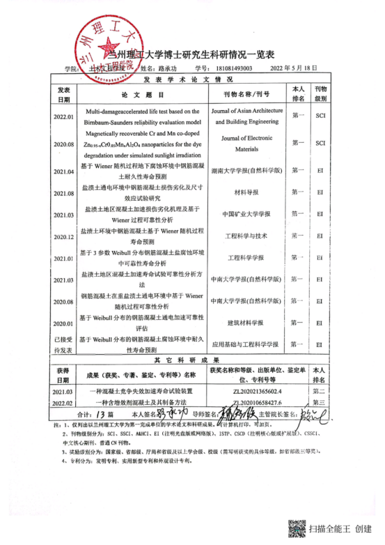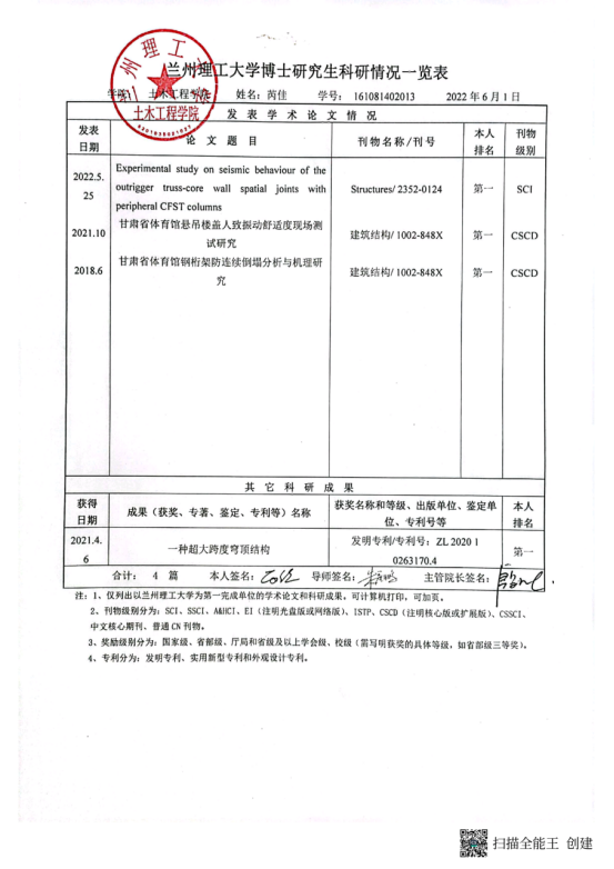 学术能力水平是博士学位授予标准基本要求。根据《兰州理工大学学位授予实施细则》要求,博士学位申请人申请学位前需在导师指导下完成一定科学研究工作,取得与博士学位论文相关的科研成果。经2022年6月10日土木工程学院学位评定分委会会议 审查通过,建议授予以下研究生工学博士学位: